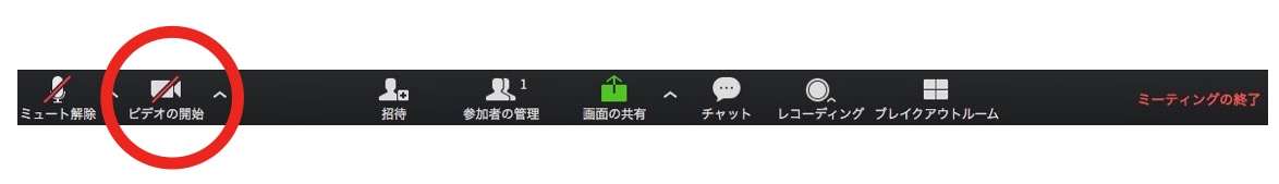 下のツールバーでカメラをオフにできます。画面の下にビデオカメラのマークがありますので、そこをクリックするとオフになります。