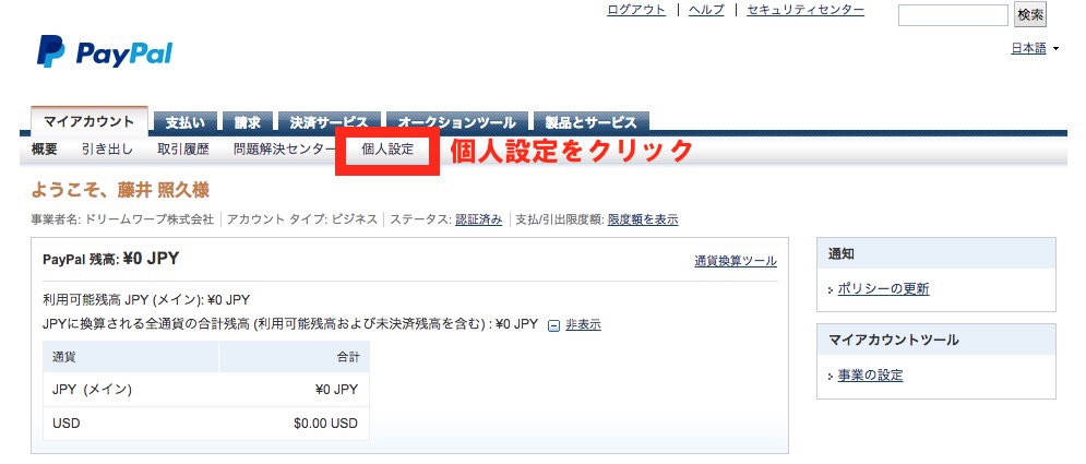 3、個人設定をクリック