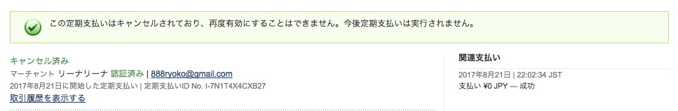 ペイパルの管理画面にログインしていただき、ご自身でご解約いただけます。